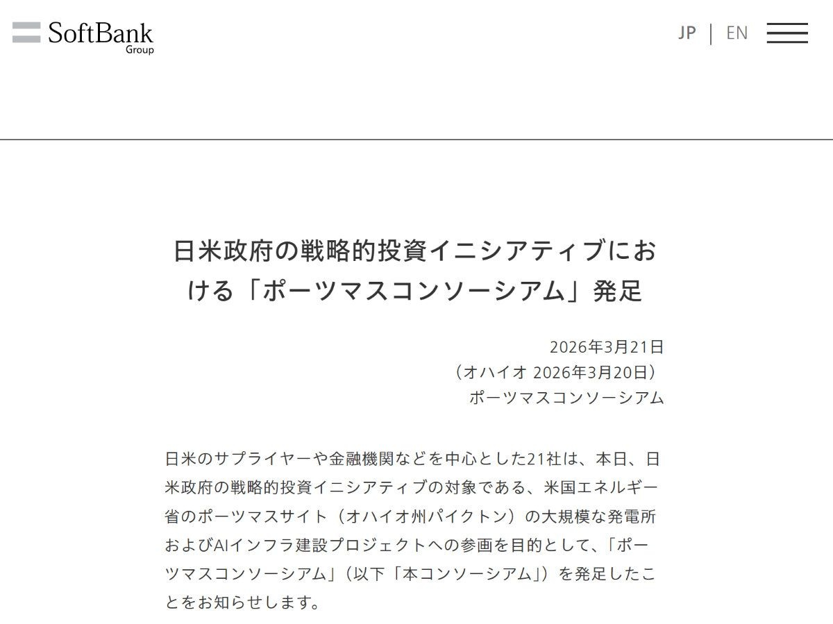 米エネルギー省は3月20日(現地時間)、AIの商業開発を推進する一環として、オハイオ州南部の廃止されたウラン濃縮施設(ポーツマスガス拡散工場)の跡地に、独自の電源を備えた大規模データセンターを開発するための官民連携を発表した。この取り組みには、日本からソフトバンクグループも参加する。同グループのSBエナジーは、米国民に費用負担を強いることなく、10ギガワット(GW)のデータセンターに電力を供給するため、9.2GWの天然ガス発電を含む合計10GWの新規発電施設を建設する計画だ。