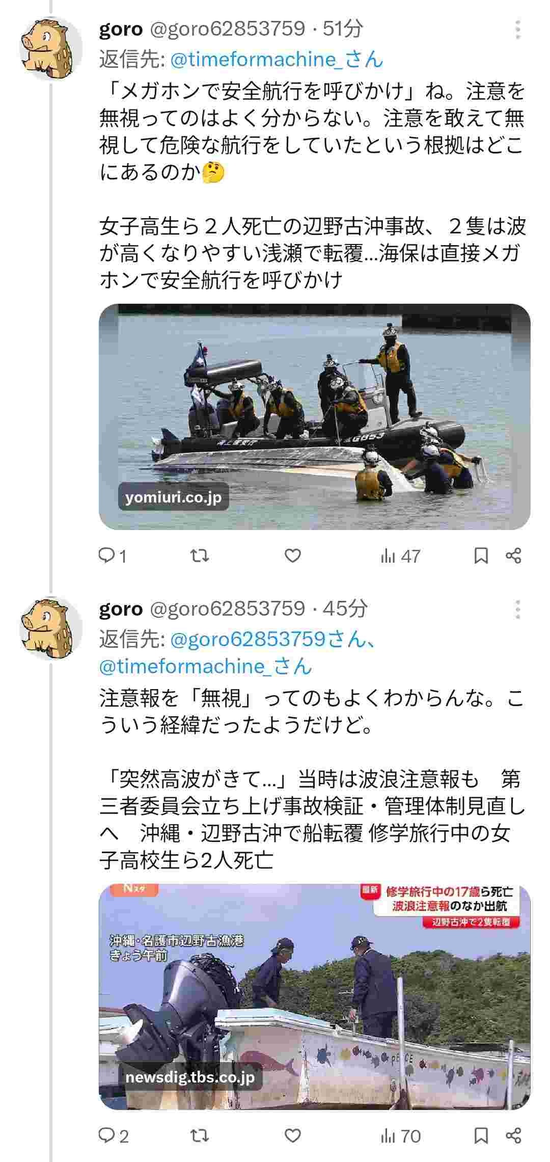 小舟に団体載せて沖合に出る狂気だ。そら注意喚起なんぞ無視だろ。