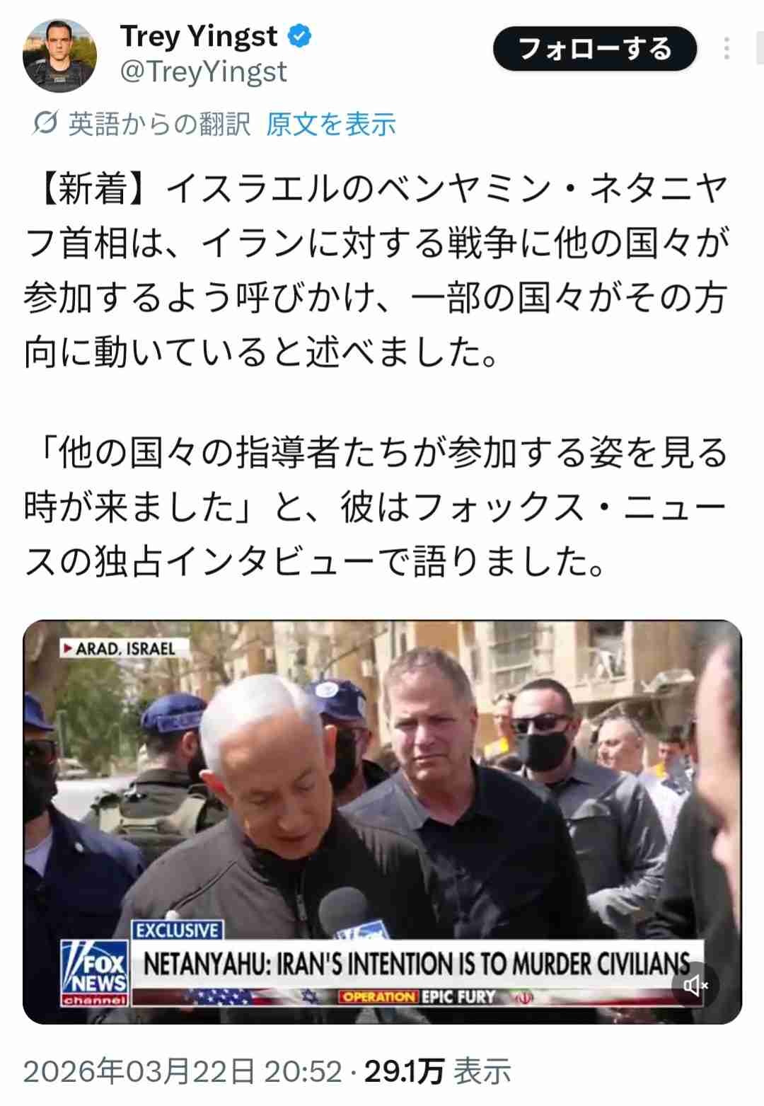 ネタニヤフ首相「対イラン戦争に参加を」諸外国に呼びかけーFOX
