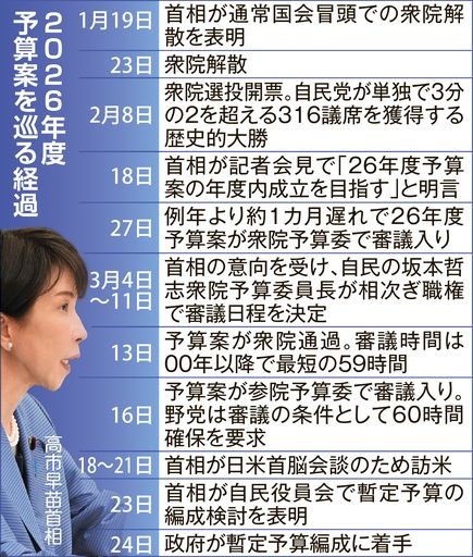 首相は衆院選以降、年度内成立にこだわってきただけに、周辺は「首相が自ら暫定予算編成を指示するわけにいかなかった。参院側から必要性を言ってもらう必要があった」と明かす。首相が衆院審議を大幅に短縮してでも年度内成立を急いだのは、1月の通常国会冒頭での衆院解散で審議入りが遅れ「政治空白を生んだ」との批判を避けるためだ。自民幹部に「衆院選で民意は示された」と繰り返し迫り、年度内成立へハッパをかけてきた。