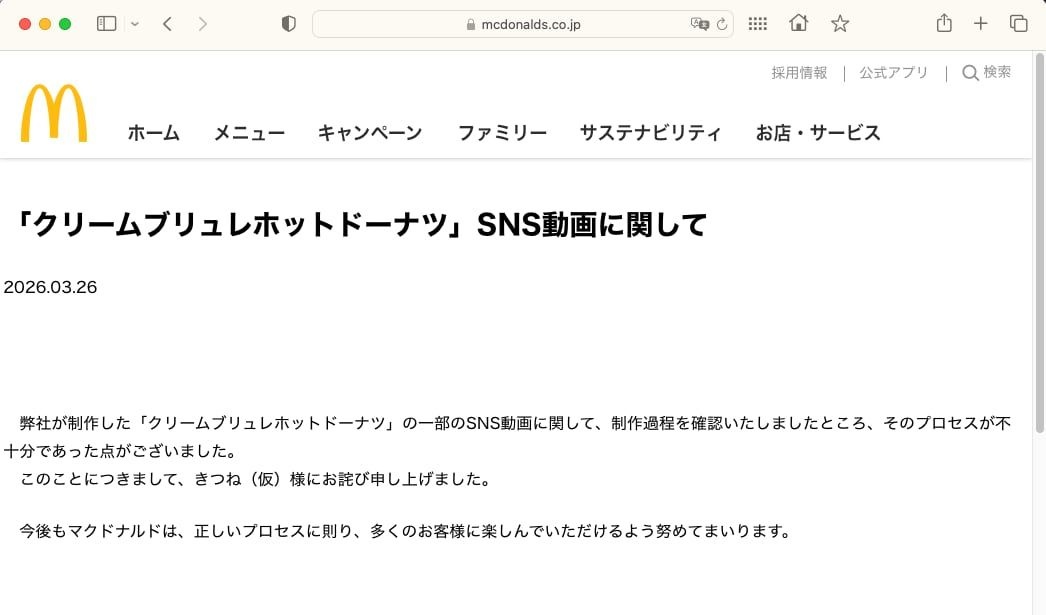 日本マクドナルドは3月26日、「クリームブリュレホットドーナツ」の一部のSNS動画について、「制作過程を確認したところ、プロセスが不十分であった点」があったと公表。「きつねゆっくり」と呼ばれる二次創作キャラクター素材を制作している「きつね(仮)」さんに謝罪したという。