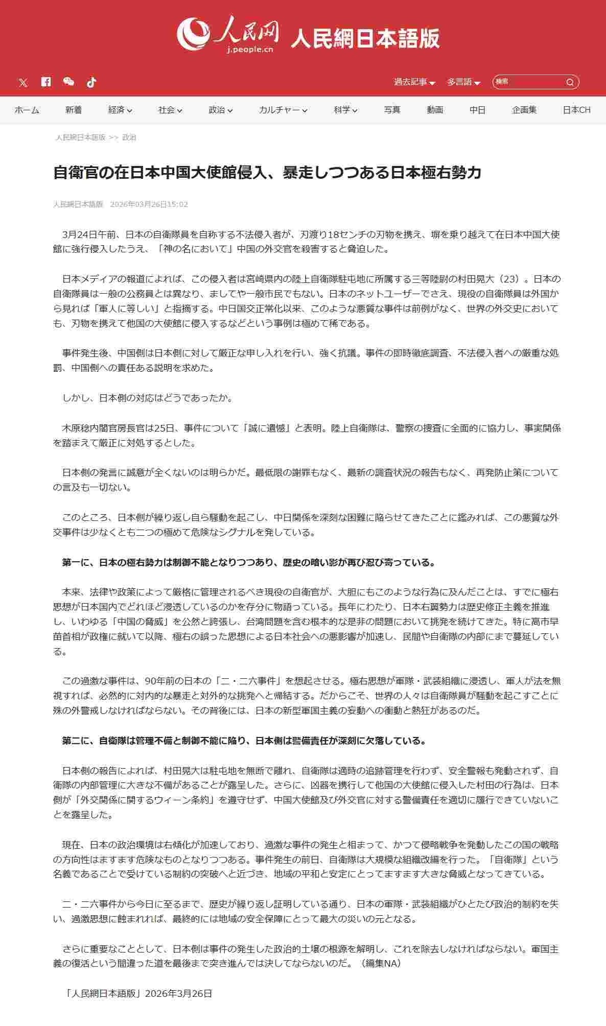 【自衛官の在日本中国大使館侵入、暴走しつつある日本極右勢力】3月24日午前、日本の自衛隊員を自称する不法侵入者が、刃渡り18センチの刃物を携え、塀を乗り越えて在日本中国大使館に強行侵入したうえ、「神の名において」中国の外交官を殺害すると脅迫した。中日国交正常化以来、このような悪質な事件は前例がなく、世界の外交史においても、刃物を携えて他国の大使館に侵入するなどという事例は極めて稀である。事件発生後、中国側は日本側に対して厳正な申し入れを行い、強く抗議。事件の即時徹底調査、不法侵入者への厳重な処罰、中国側への責任ある説明を求めた。しかし、日本側の対応はどうであったか。