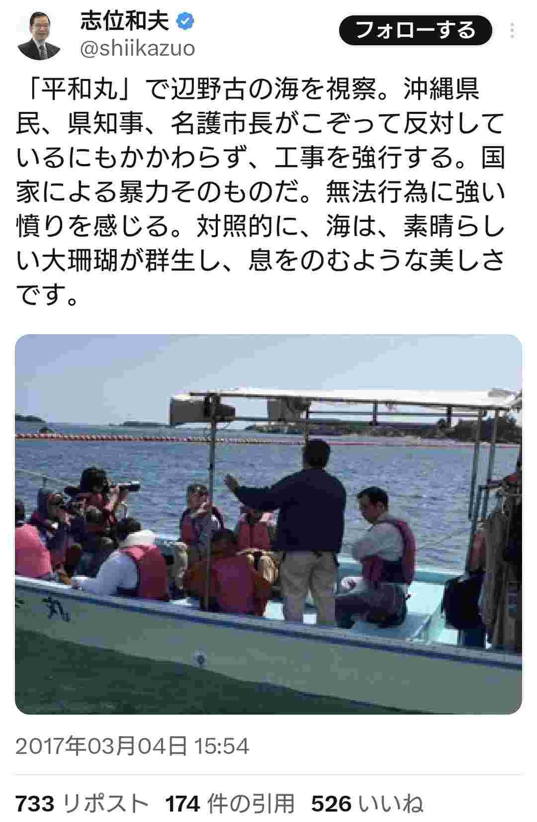 共産党・志位氏「平和丸で辺野古の海を視察。素晴らしい大珊瑚が群生し、息をのむような美しさです」