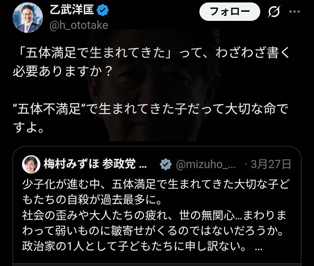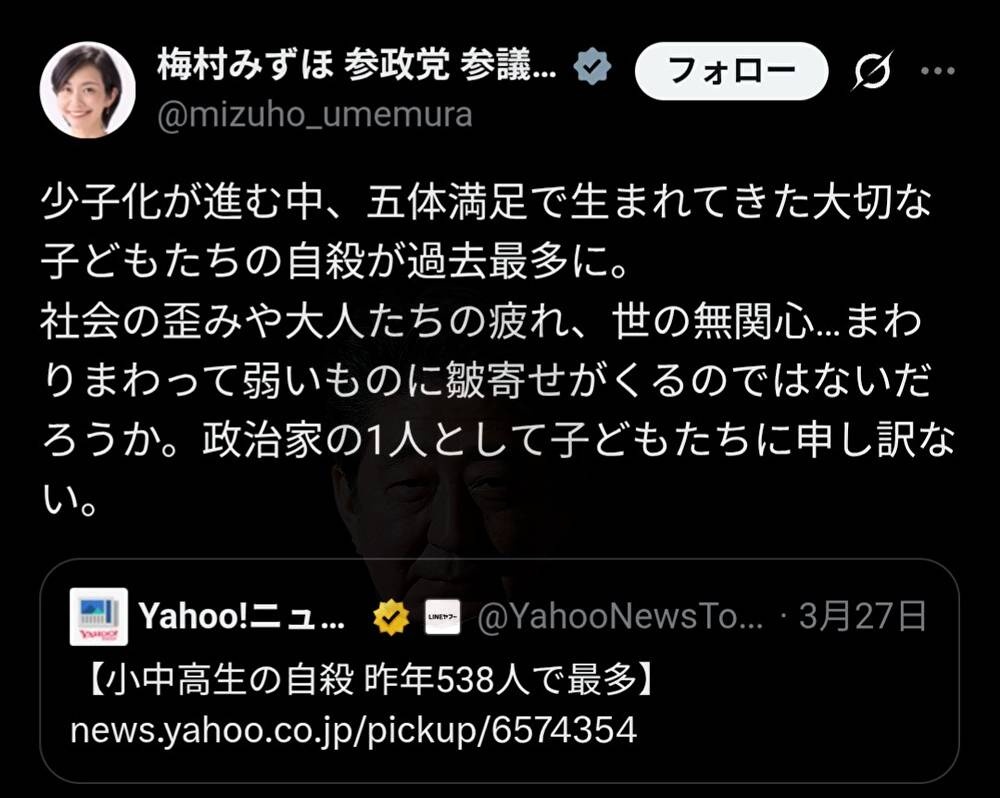 梅村みずほ「″五体満足″で生まれた子どもたちの自殺が最多に…」???「″それ″書く必要ある?」