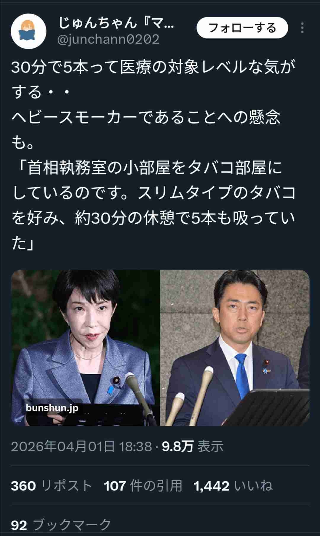 「首相執務室の小部屋をタバコ部屋にしているのです。スリムタイプのタバコを好み、約30分の休憩で5本も吸っていた」続報は明日の文春を待て