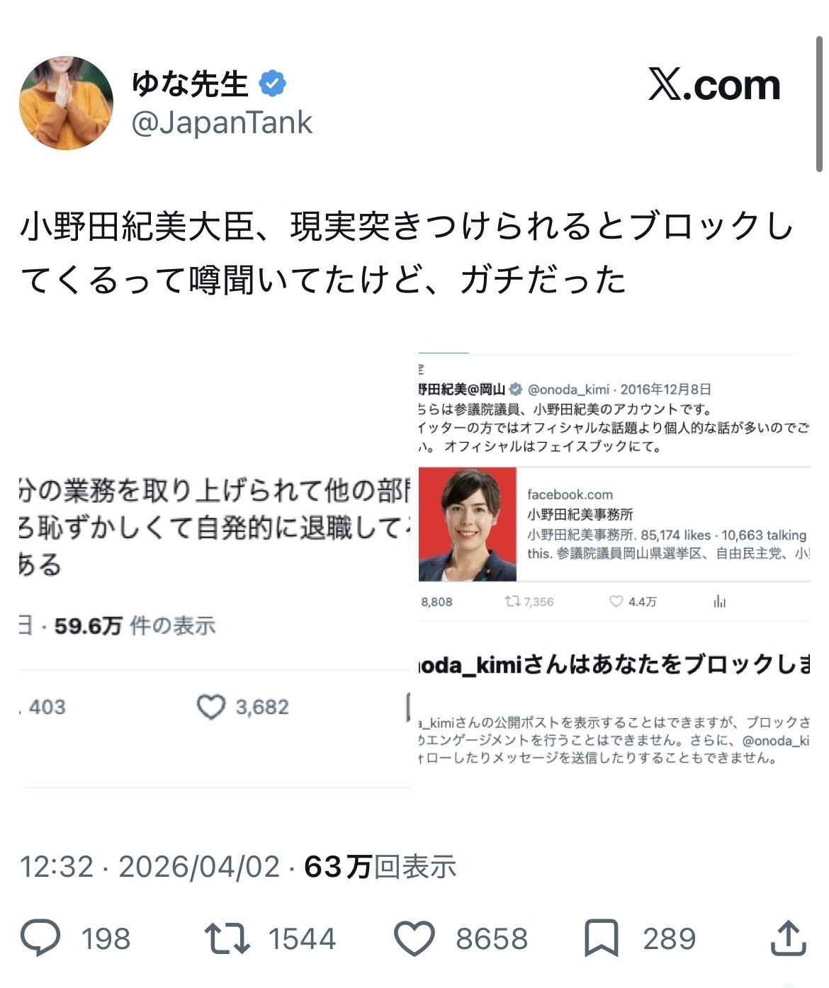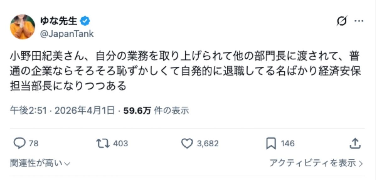 小野田氏は3月24、31日に行われた「中東情勢に関する関係閣僚会議」の議事録にも名前が上がっていない。Xでは、新大臣に小野田氏ではなく、赤沢氏が任命されたことについて、以下のような反応が起こっている。