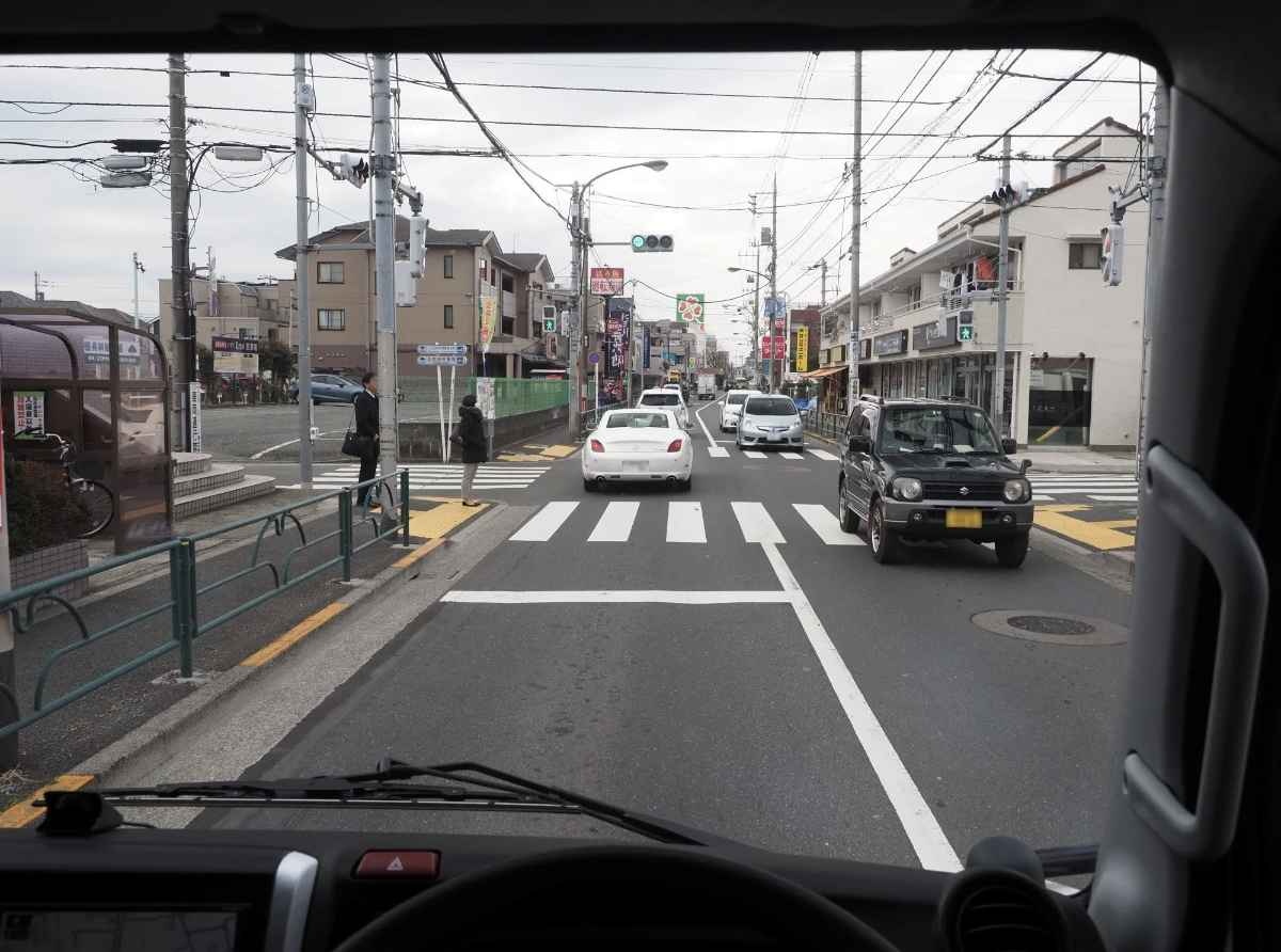 引っ越しのために借りたトラックで交差点を左折するとき、どんなことに注意するか、下の写真から考えてください。