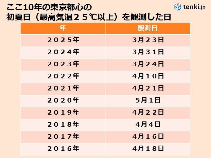 暖かい空気が流れ込み、日差しも届くため、気温はグンと上昇するでしょう。九州から東北南部にかけて、最高気温は20℃を超えて、東京では25℃の予想です。東京都心で夏日になれば今年初となります。この時期に夏日になるのは意外に思うかもしれませんが、昨年までの3年間は3月のうちに夏日になっているため、それほど珍しいことではありません。ただ、まだ暑さに慣れていない時期です。