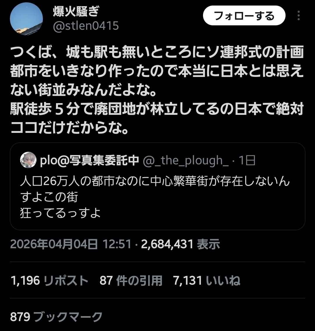 つくばはつくば市自体の造りよりも「所詮茨城だ」という点に気をつけた方がいいな他県からの移住者は