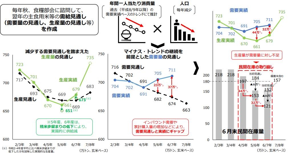 農林水産省は、人口減少等による需要のマイナス・トレンドの継続を前提として、翌年産の需要量の見通しと生産量の