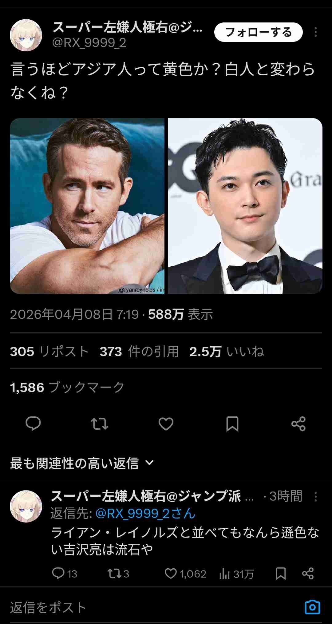 これライアン・レイノルズはすっぴんだろうけど右は化粧してるだろ