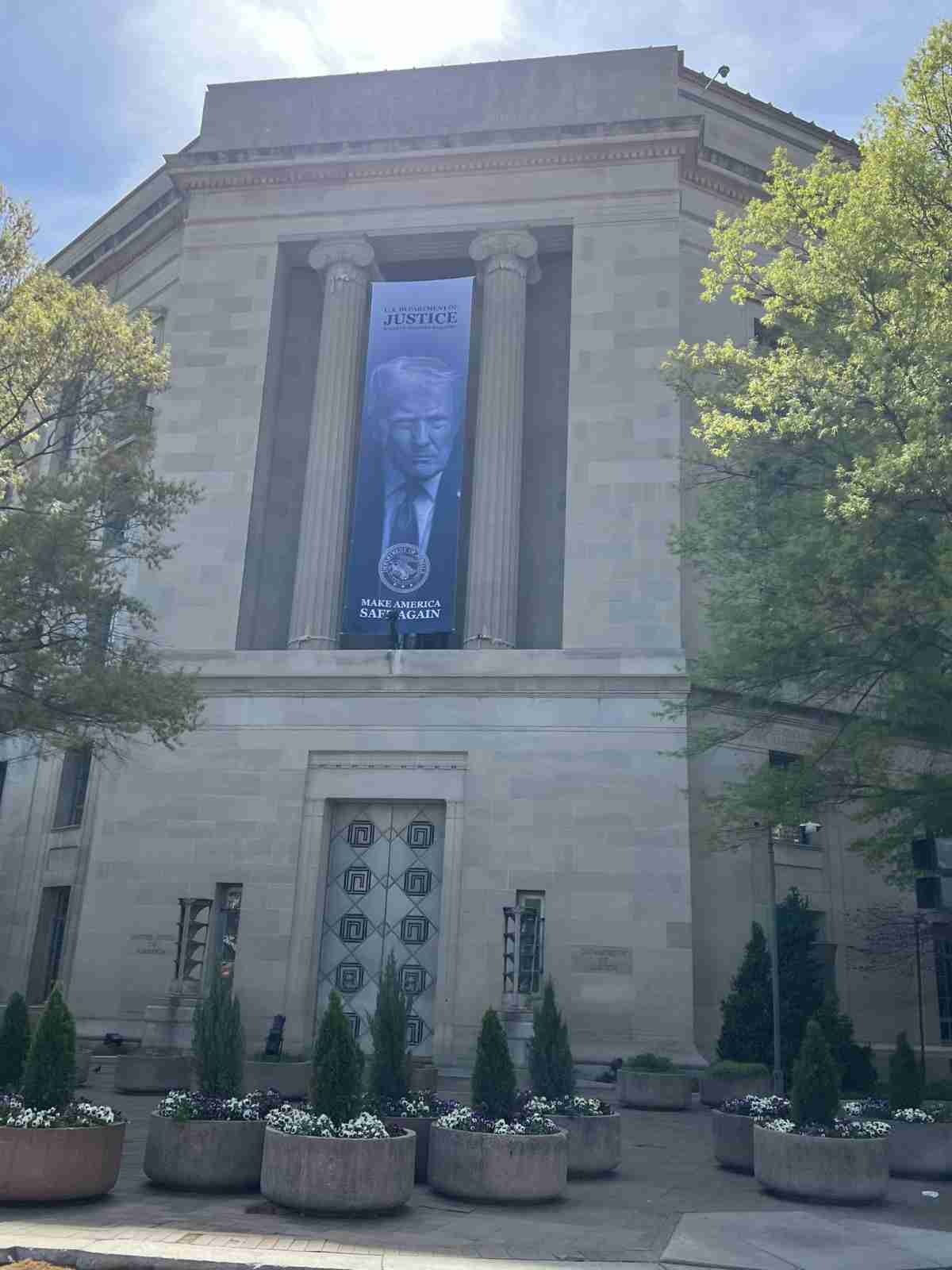 首都ワシントンにある司法省の外壁に2月、トランプ氏の顔をあしらった巨大な垂れ幕が掲げられた。政治から距離を置き、独立性を建前としてきた同省の変質を象徴する光景だ。