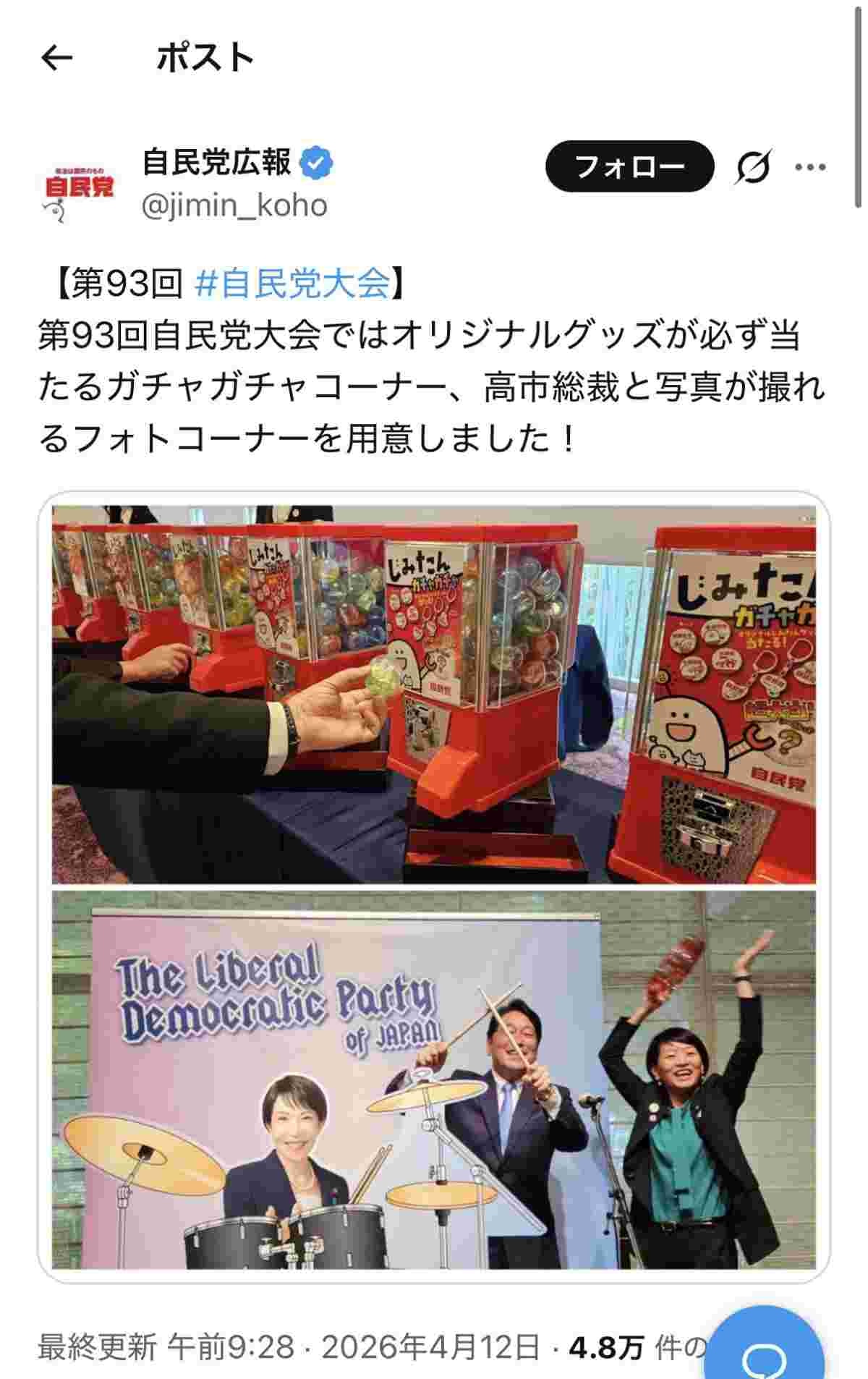 第93回自民党大会ではオリジナルグッズが必ず当たるガチャガチャコーナー、高市総裁と写真が撮れるフォトコーナーを用意しました!