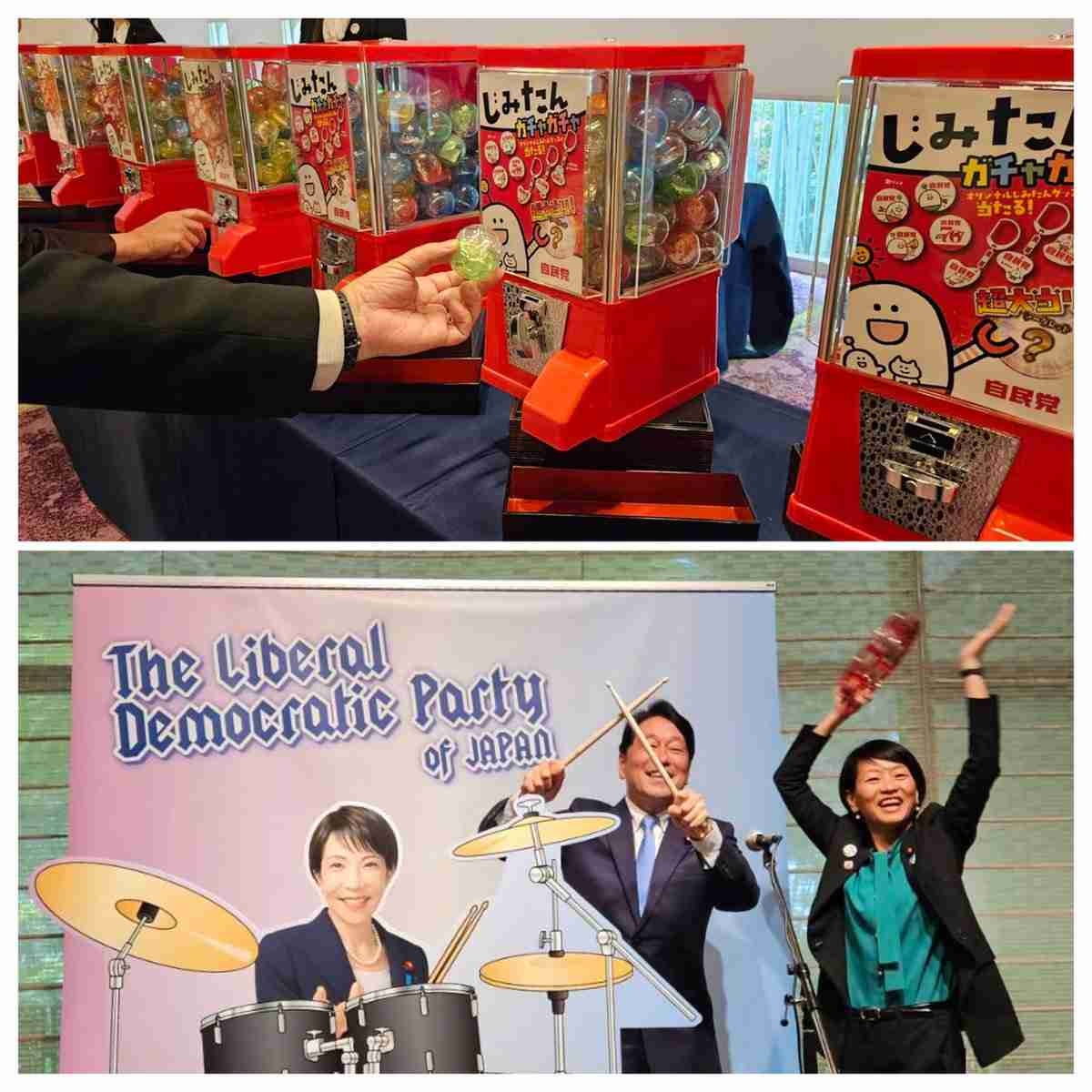 会場内には、党の新広報キャラクターとして誕生した「じみたん」をあしらったガチャガチャが、20台並んだ。出席者が、引き換えたコインを使ってガチャに挑戦できるという企画。用意された景品は4種類で、じみたんのミニ缶バッジやキーホルダーのほか、「大当たり」として高市首相が国会で愛用している様子をとらえられ、「サナエ売れ」したことで知られるボールペン、また「超大当たり」は、高市首相が「休憩も戦略のうちや。ぼちぼちいこか」「あんたならやれる。私は信じてるで。ファイト!」などと語りかける8種類の特別生ボイス機能が付いたアクリルスタンドが、それぞれ20人分ずつ用意された。
