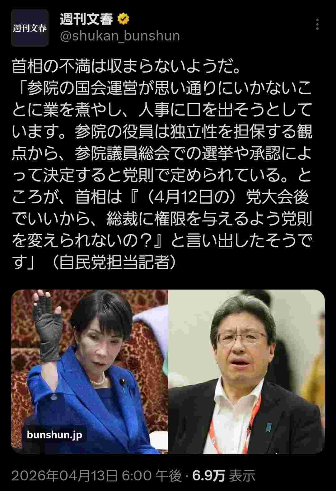 高市「言う事聞かない参院の自民ムカつくわ😡もう私に権限よこしなさいよ!」遂に党則を変えろと言い出す