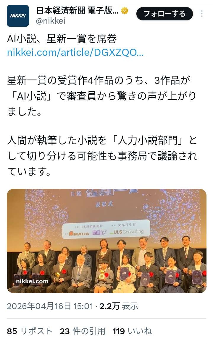 星新一の名前を冠する賞ならAIが選ばれてもおかしくはないな