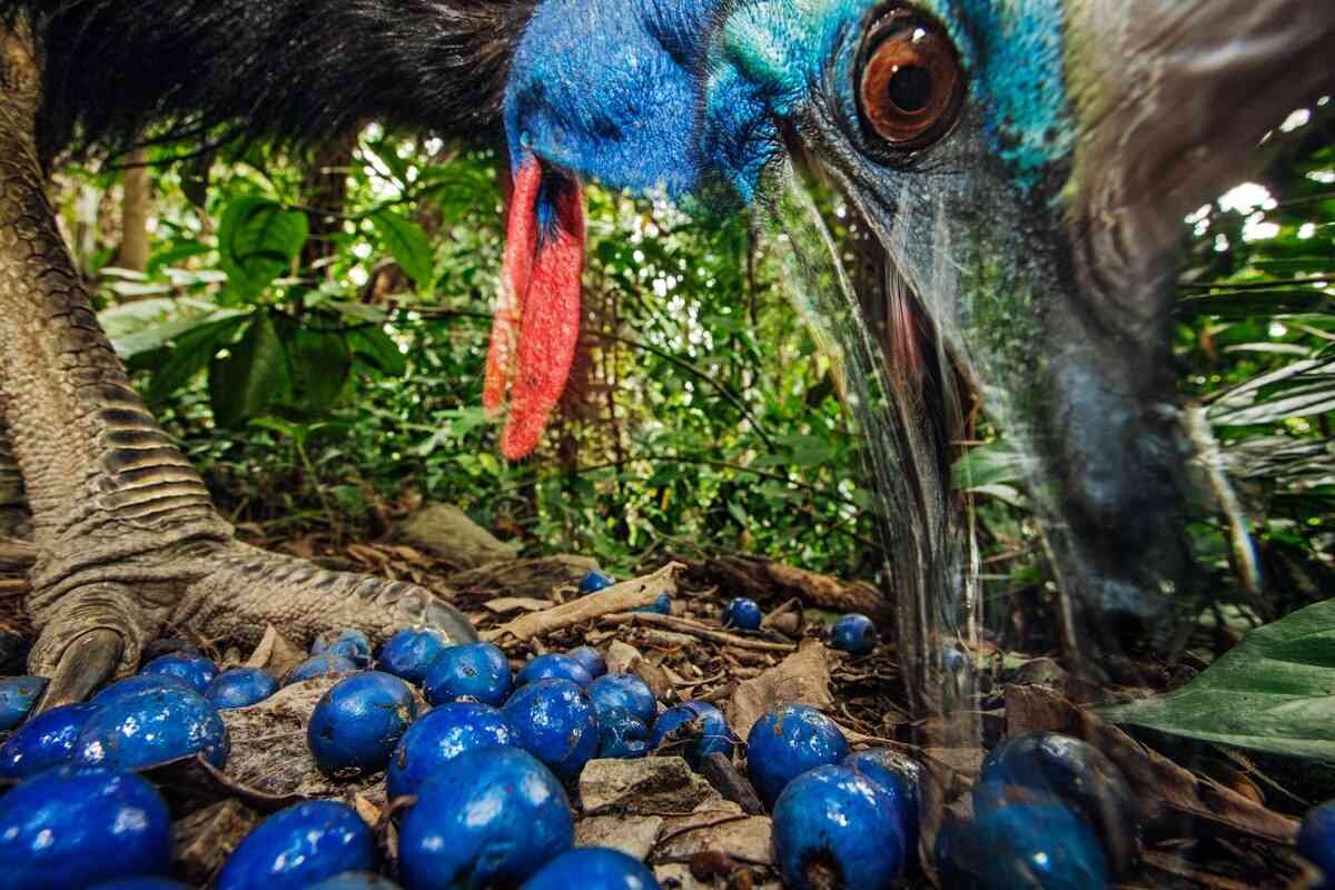 好物のゴウシュウビャクダンの実を食べるオスのヒクイドリ。(CHRISTIAN ZIEGLER, NAT GEO IMAGE COLLECTION)