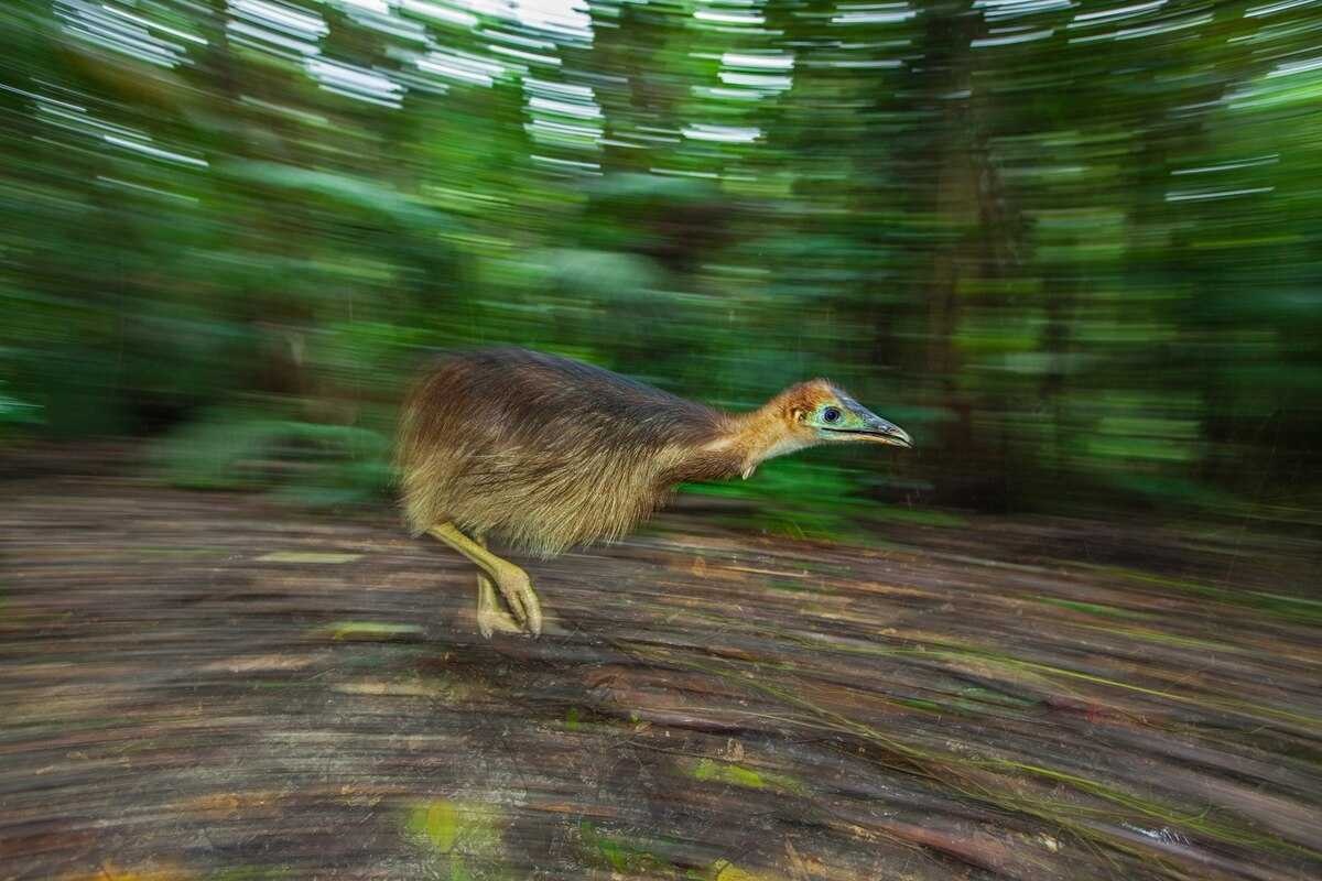 果実が地面に落ちた音を聞きつけ、全速力で探しに行くヒクイドリのひな。(CHRISTIAN ZIEGLER, NAT GEO IMAGE COLLECTION)