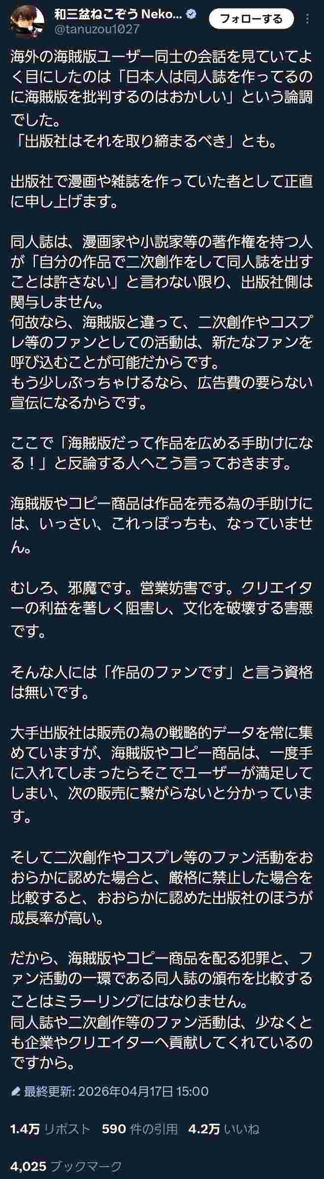 いや同人誌と海賊版は違うだろ