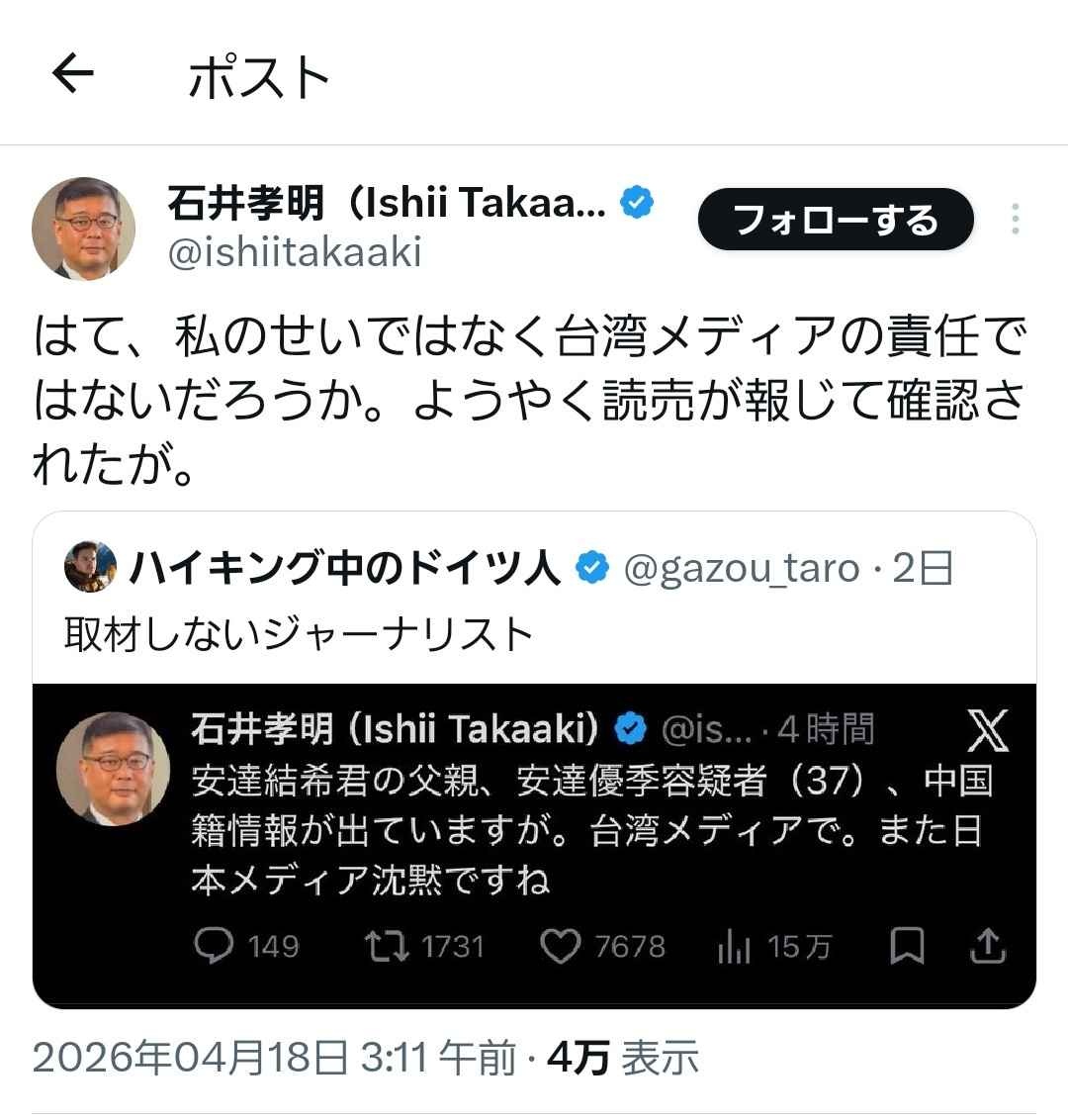 日本国籍と報じる→わざわざ日本人と言うのは怪しい!帰化人だろ!😡もしくは日本人と報じる必要がない!日本を貶めるオールドメディアの陰謀だ😡
