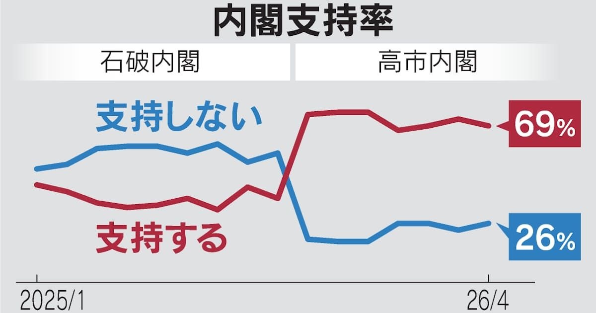 日本経済新聞社とテレビ東京は24〜26日に世論調査をした。高市早苗内閣の支持率は69%で、3月の前回調査から3ポイント低下した。内閣を「支持しない」は26%となり、前回より3ポイント上昇した。