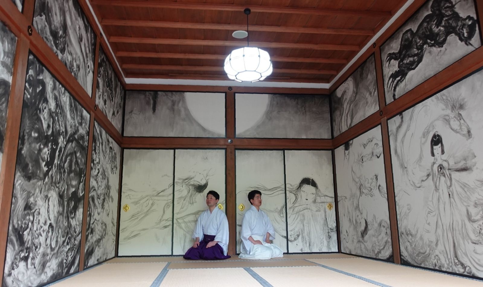 ふすま絵は天野さんが以前に同大社に別の作品を奉納した縁から制作が決まり、「光と闇」をテーマに昨年5月、社務所書院に約1週間こもって制作。同大社の伝説や世界の神話を基に女神や龍、ゲームに登場するモンスターなどが入り交じる壮大な構図を、墨で17面のふすまや壁全体に大胆に描き上げた。作品は「INARI」と題し、同大社に奉納された。