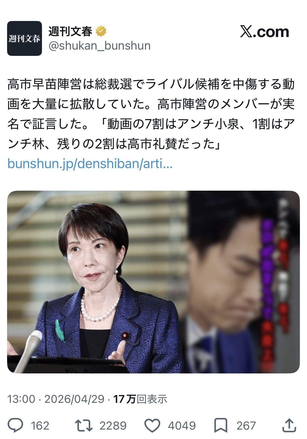 でも文春も高市絶賛してたのを忘れてねーぞ