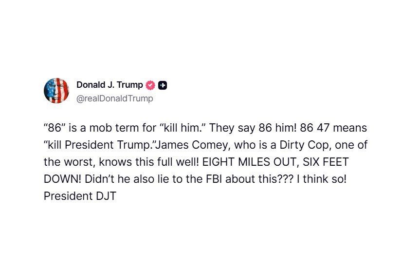 トランプ大統領が29日深夜に「『86』はマフィア用語で『殺せ』という意味だ。マフィアは『86しろ!』と言う。『8647』は『トランプ大統領を殺せ』を意味する。最悪な汚職警官のジェームズ・コミーはこのことをよく知っている!EIGHT MILES OUT、SIX FEET DOWN!(8マイル先、6フィート下!)彼はこの件についても、FBIに嘘をついたのではないか???絶対そうだ!」と投稿しました。