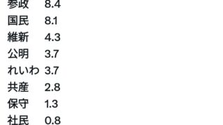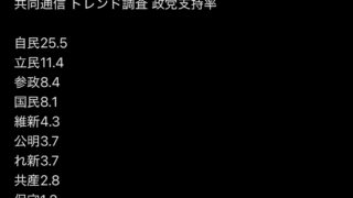 嫌儲 共同通信の政党支持率調査で参政党8.4%と国民民主党を抜いて3位。自民が25.5%、立憲11.4%