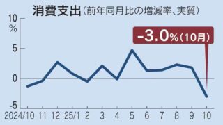 嫌儲 10月の日本人の消費支出、突然3%も減る 高市になるまでは順調に支出が前年比で伸びてたのに一体なぜ??