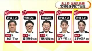 ニュー速+ 衆院選宮城1-5区すべてで自民党が当選 小選挙区制導入後初 比例では和田政宗氏復活当選