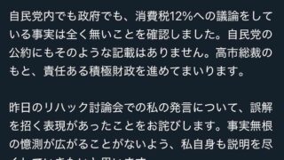 嫌儲 消費税12%発言した自民候補「国民が誤解した。自民党内でも政府でも、消費税12%への議論をしている事実は全く無いことを確認しました」