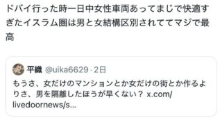 嫌儲 女性「ドバイ行ったら一日中女性専用の車両があって最高だった。日本も男女を区別するイスラム圏を見習うべき」