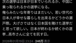 嫌儲 「日本が日本でいられるか、中国に乗っ取られるかの選挙になる。高市さんに全てを託す日」5万いいね