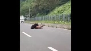 ニュー速+ 【ヒグマ速報】車道でヒグマがエゾシカの首元をくわえ林の方へ引きずっていくのを視聴者が撮影 北海道・羅臼町