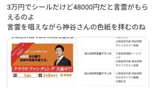 嫌儲 【画像】参政党「クラウドファンディング1億円!4万8千円で神谷宗幣の言霊を返礼します!!」カルトでは?