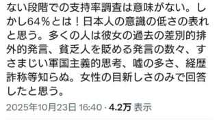 ニュー速 パさん「高市内閣支持率が64%とは!日本人の意識の低さの表れと思う。」