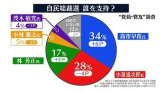嫌儲 【党員調査】前回と同じくすぐに高市が小泉を逆転。前回と同じかww高市さん34%(前回28%)、進次郎28%(34%)
