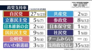 嫌儲 政党支持率、自民27%国民9%参政8%立民5%…読売新聞
