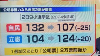 嫌儲 公明非協力なら解散総選挙で自民107議席(-25)立憲124議席(+20)の衝撃www(小選挙区)