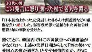 嫌儲 95歳の韓国人老人「日本の統治時代はよかった」→ 怒り狂った30代の韓国人男に杖で頭を殴られ死亡